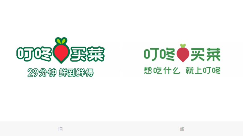 去掉輪廓描邊后,紅蘿卜顯得更加圓潤肥碩,兩片綠色的蘿卜纓連接在一起,形成一個綠色的心形符號。品牌口號也從之前的「29分鐘鮮到鮮得」變更為「想吃什么 就上叮咚」。個人理解的是,前者強調(diào)高效率的便利購物體驗,后者則囊括了生鮮美食等滿足各類家庭生活所需的產(chǎn)品。