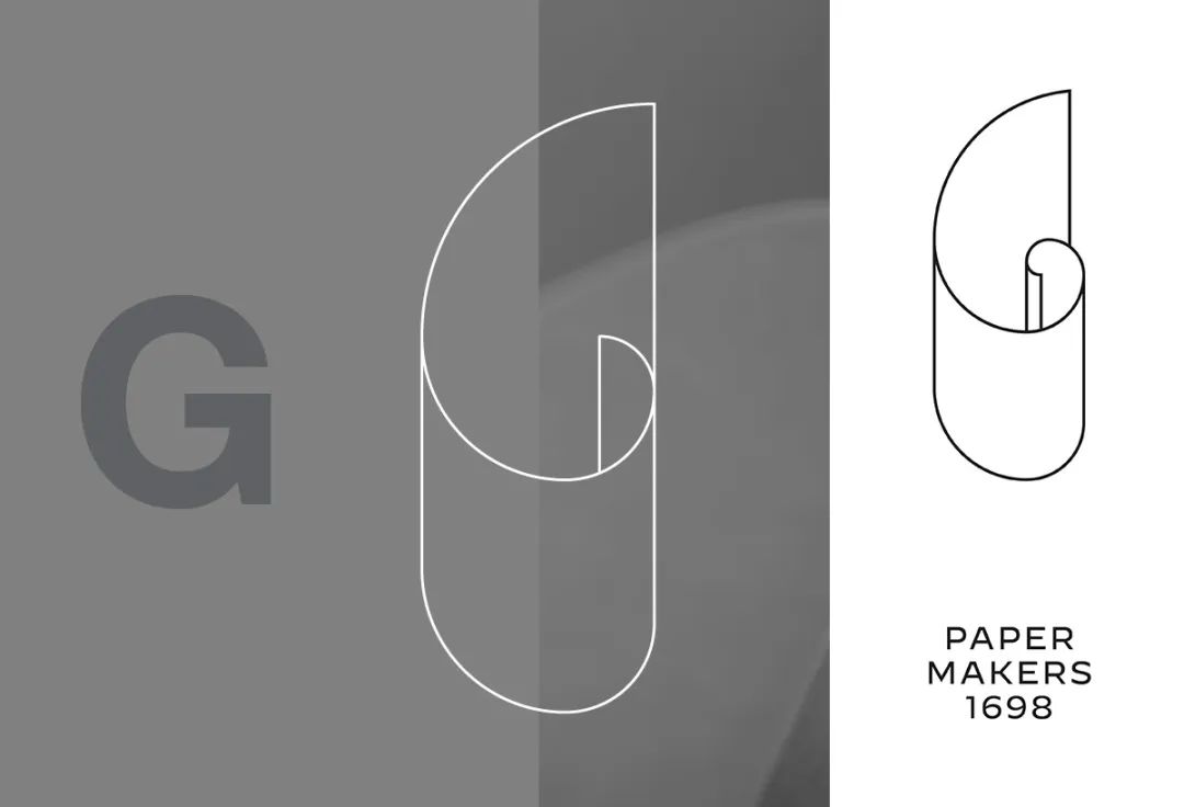 結(jié)合了紙張卷起來的打包方式以及黃金比例,一個(gè)波浪形的G字符號(hào)就此誕生。然后在圖形的下方添加上「Paper Makers 1698」字樣,以強(qiáng)調(diào)其悠久的品牌歷史。