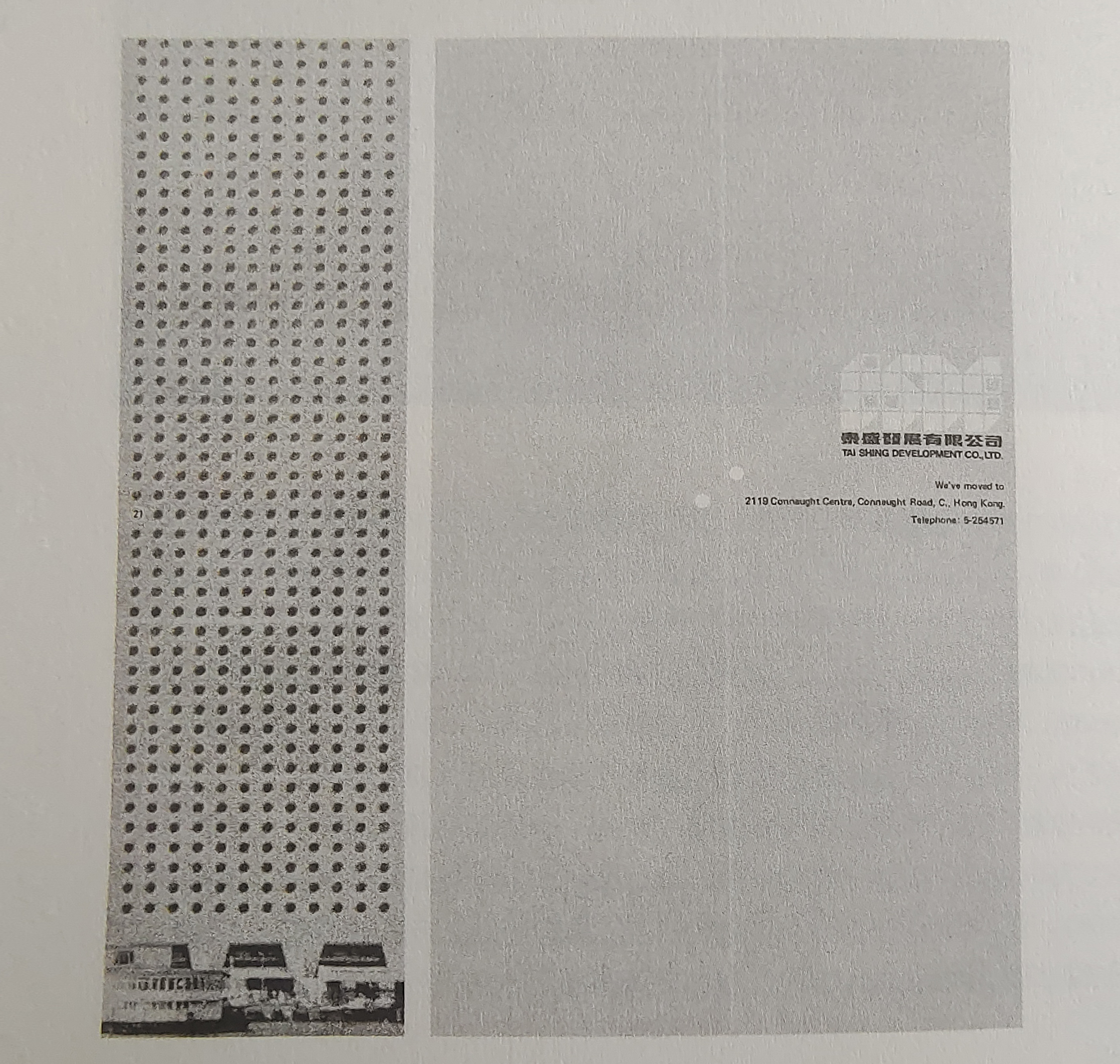 大廈的形象,是運(yùn)用攝影上的紗網(wǎng)來(lái)處理,用赤灰與黑印刷。內(nèi)頁(yè)紅色底黑色和白色商標(biāo)。這卡的形狀窄長(zhǎng),正如建筑物外形的比例一樣,使設(shè)計(jì)更易于傳達(dá)它所承載的信息。