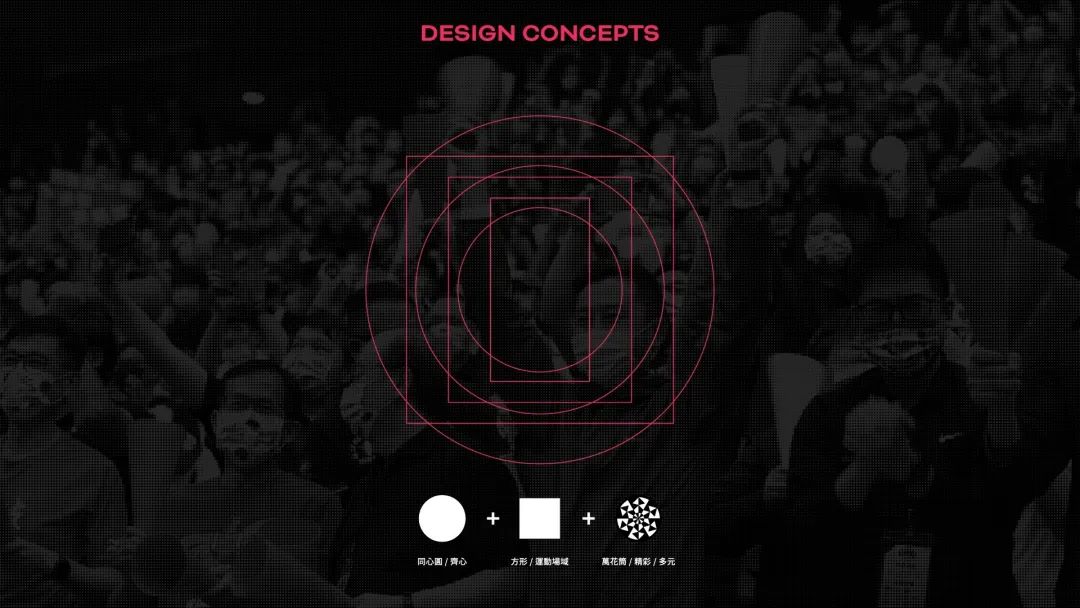 家的齊心——同心圓/方形結(jié)構(gòu)的運(yùn)動(dòng)場(chǎng)——四方型以及代表回憶與精采賽事——萬(wàn)花筒結(jié)構(gòu),發(fā)展出新視覺(jué)系統(tǒng)與LOGO。